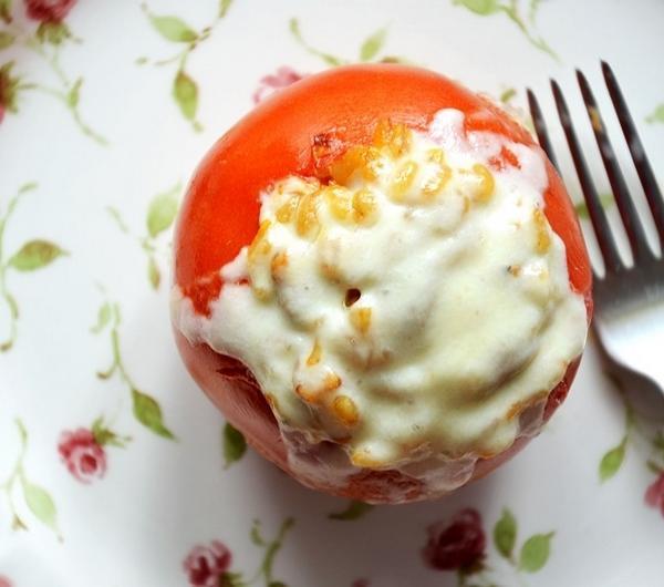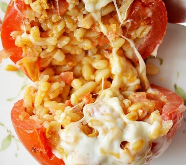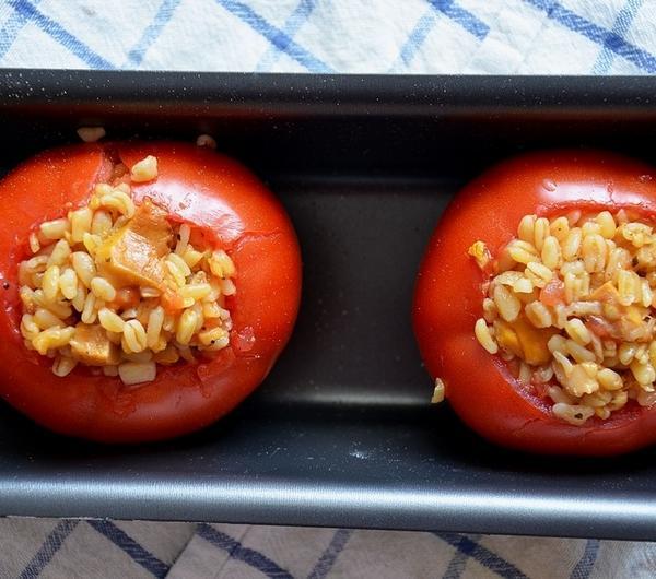 Składniki (na 2 duuuże pomidory):2 duże, twarde pomidory1/2 szklanki kaszy pęczak1 spora, młoda cebulka (może być ze szczypiorkiem)1 łyżka masła1 łyżka oliwy z oliwek100-150 g kurekłyżka albo dwie orzeszków piniii1/2 szklanki białego, wytrawnego winakawałek sera mozzarella (można też dać inny ulubiony ser, np parmezan, albo po prostu jakiś żółty ser)sól, pieprz, suszona bazylia, suszone oreganoPrzygotowanie:Pomidory dokładnie myjemy, nożem wykrawamy otwór na górze, wycinając przy tym cały ogonek. Następnie łyżką wydrążamy całego pomidora, usuwamy pestki i miąższ zostawiając odrobinę miąższu przy skórce, żeby pomidory się nie rozpadły. Miąższu oczywiście nie wyrzucamy.Piekarnik nagrzewamy do 180 stopni. Na patelni roztapiamy masło i oliwę, dodajemy posiekaną cebulkę i lekko szklimy, następnie dodajemy dokładnie umyte i pokrojone w kostkę kurki. Od razu dorzucamy kaszę i wszystko smażymy kilka minut, aż kurki puszczą wodę. Dodajemy białe wino i ponownie gotujemy aż kasza wchłonie cały płyn. Dodajemy jeszcze około pół szklanki wody i miąższ z pomidorów znowu gotujemy na wolnym ogniu. Kasza w sumie powinna gotować się około 10-12 minut. Wszystko doprawiamy do smaku solą, pieprzem, suszonymi ziołami i dodajemy orzeszki pinii. Pomidory układamy w żaroodpornym naczyniu, nadziewamy dokładnie kaszą i kurkami (na ścisk ;)) i wstawiamy na nagrzanego piekarnika na około 30 minut, aż pomidory będą już miękkie. Na około 10 minut przed końcem pieczenia kładziemy na wierzchu kawałek mozzarelli (albo innego sera). Pomidory doskonale smakują oczywiście na gorąco od razu po wyjęciu z pieca