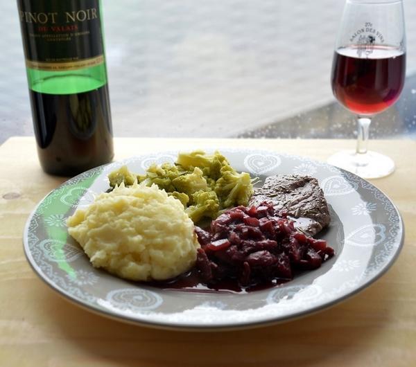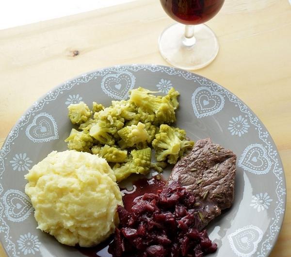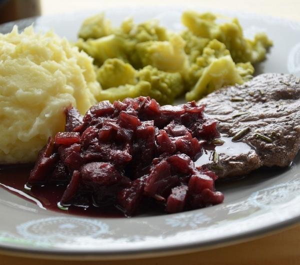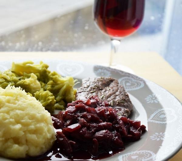 Składniki (na dwie porcje):2 steki wołoweodrobina świeżo mielonego pieprzuodrobina suszonego rozmarynuodrobina oleju roślinnego do smażeniaSosok 5-6 suszonych daktyli1 mała czerwona cebulaok 300 ml czerwonego wina (najlepiej pinot noir)1 łyżeczka sproszkowanego imbiruok 2 łyżeczek cukru (zależy od kwaśności wina)1 czubata łyżeczka masłaPure ziemniaczano-pietruszkowe3 ziemniaki1 pietruszka1 łyżka masłaok 4 łyżek mlekasólDodatki np. ugotowane brokuły, kalafior lub jakaś sałatkaPrzygotowanie:Sos: Z daktyli usunąć pestki i pokroić dość drobno, wrzucić do rondelka. Dodać pokrojoną w drobną kostkę czerwoną cebulę, zalać czerwonym winem. Dodać imbir, cukier i gotować przez ok 20-30 minut pod przykrywką na wolnym ogniu, aż wszystkie składniki praktycznie się rozpadną. Tuż przed podaniem dodać do sosu zimne masło i dokładnie rozmieszać.Pure : Ziemniaki i pietruszkę obrać i ugotować do miękkości (ok 20 minut). Gorące warzywa rozgnieść widelcem i od razu dodać masło, mleko i doprawić do smaku.<./p>Steki: Mięso wyjąć z lodówki na ok 20 minut przed smażeniem, oprószyć świeżo mielonym pieprzem i rozmarynem. Smażyć na rozgrzanej patelni po ok kilka minut z każdej strony (w zależności od grubości steku i stopnia wysmażenia jaki lubimy). Steki odłożyć na talerz i dać im odpocząć kilka minut, zanim zaczniemy jeść.Wszystkie składniki dania można robić oczywiście w tym samym czasieSmacznego!