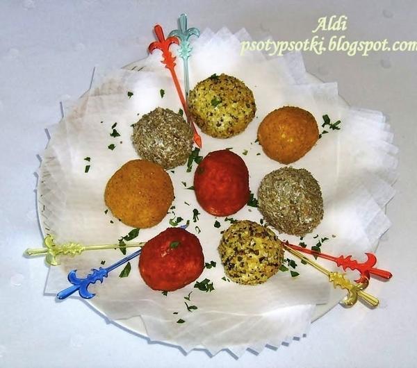 Za pomocą łyżki do wykrawaniaowoców ukształtowałam kulki.Kilka z nich obtoczyłam w majeranku, inne w czerwonej,słodkiej papryce, kolejne w curry, w cytrynowym pieprzu, w oregano, w uprażonych pestkach słonecznika i w kokosowych wiórkach.Te ostatnie zniknęły, zanim zdążyłamułożyć je na półmisku ;)Przekąska prezentuje się apetycznie i zachęcająco. Twarożkowe śnieżki można podać z krakersami, świeżymirogalikami, bułkami, albo z pumperniklem.Bardzo smacznie polecam :)