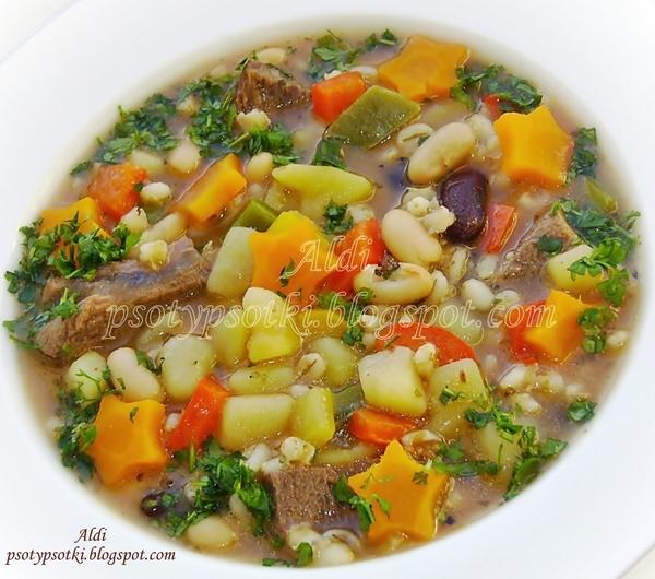 Bardzo syta, rozgrzewająca i aromatyczna zupa idealna na mrozy, które od kilku dninam towarzyszą. Przepisznalazłam w pewnej włoskiejgazecie z ubiegłego wieku.Spodobała mi się ogromnailość składników i pięknyopis, który spowodował,że nie mogłam się jej oprzeć.Wprowadziłam drobne zmiany i ochoczo zabrałam się do pracy :)50 dag wołowego mięsa: pręgaoraz szponder, 4 ziemniaki,2 marchewki, mała pietruszka, plaster selera, cebula, cukinia, pół papryki czerwonej,pół zielonej i pół żółtej, pół puszki czerwonej fasoli, puszka fasoli białej,pół szklanki kaszy pęczak, 2-3 liście laurowe, 4 ziarna ziela angielskiego,4 jagody jałowca, pieprz, mała papryczka peperoni, sól morska.Mięso oczyściłam, umyłam, zalałam wodą. Postawiłam na ogniu.Kiedy płyn zawrzał zmniejszyłam płomień do minimum, gotowałam pod przykryciem. Po godzinie dodałam marchew, pietruszkę, seler,przyprawy oprócz peperoni i pęczak. Gotowałam dalej przez około 1,5 godziny.Jarzyny i mięso wyjęłam, pokroiłam, włożyłam z powrotem do zupy.Paprykę i cukinię pokroiłam w kosteczkę i zasmażyłam na oliwie.Ziemniaki obrałam, pokroiłam w kostkę, włożyłam do garnka.Gdy były miękkie dodałam paprykę z cukinią oraz opłukaną fasolę.Doprawiłam papryczką peperoni i solą. Dodałam też odrobinę majeranku.Bardzo smacznie polecam :)