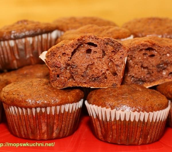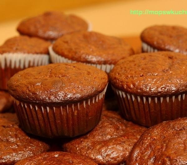 Składniki na 20 sztuk (z moimi zmianami):250 g mąki pszennej2 łyżki kakao2 łyżeczki proszku do pieczenia1/2 łyżeczki sody oczyszczonej100 g gorzkiej czekolady2 jajka300 ml śmietany 12%100 g cukru pudru1/2 szklanki oleju rzepakowego1 słoik dżemu malinowego (ok. 250 ml)