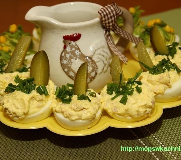 Składniki:6 jajek2 plastry szynki wędzonej1 łyżka chrzanu tartego1 łyżka śmietany 18%pieprzszczypiorek1 ogórek kiszony1. Jajka ugotować na twardo, ostudzić, obrać i przekroić na pół. Wyjąć żółtka.2. Żółtka rozetrzeć widelcem, połączyć ze śmietaną, chrzanem, pokrojoną drobno szynką oraz pieprzem.3. Faszerować jaja, udekorować koperkiem i kawałkami ogórka kiszonego.