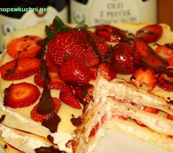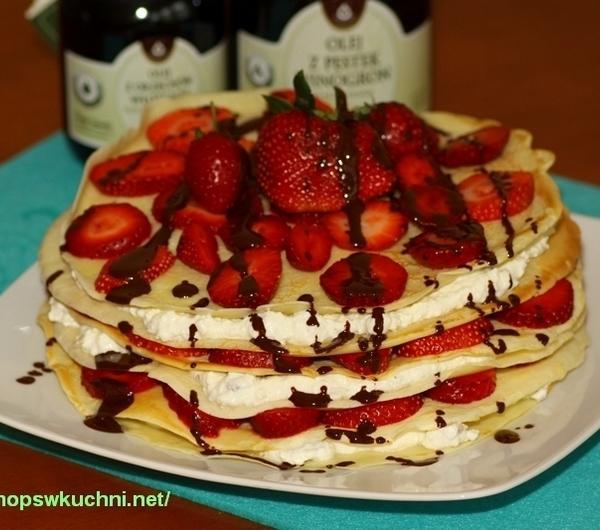 1. Przygotować ciasto na naleśniki. Wymieszać mleko z jajkami, mąką, solą i 1 łyżką oleju z pestek winogron.2. Smażyć naleśniki na patelni powleczonej cienką warstwą oleju z pestek winogron. Z tej ilości powinno wyjść 6 naleśników (na patelni o średnicy 24 cm).3. Usmażone naleśniki pozostawić do ostygnięcia.4. Ser biały rozdrobnić i wymieszać ze śmietaną, cukrem pudrem i orzechami.5. Truskawki opłukać, wyjąć z nich szypułki (3 truskawki pozostawić w całości do dekoracji), pokroić w plasterki.6. Na dużym talerzu lub paterze ułożyć warstwy torciku: naleśnik – ser – naleśnik – truskawki – naleśnik – ser – naleśnik truskawki – naleśnik – ser – naleśnik – truskawki (3 warstwy sera i 3 warstwy truskawek).7. Czekoladę podzielić na kostki i rozpuścić w misce nad gotującą się wodą. Zdjąć czekoladę znad pary, nieco ostudzić i następnie wymieszać z łyżką oleju z orzechów włoskich i cukrem waniliowym.8. Polać sosem czekoladowym wierzch tortu naleśnikowego.9. Najlepiej podawać schłodzony, z lodówki.