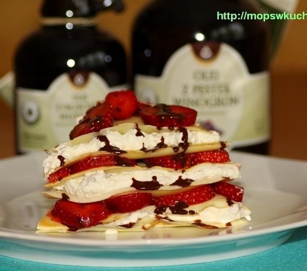 Składniki:300 ml mleka 2%2 jajkaszklanka mąki pszennejszczypta soli2 łyżki oleju z pestek winogron OLEOFARM0,5 kg truskawek0,25 kg twarogu półtłustego100 ml śmietany 12%1 łyżka cukru pudru50 g posiekanych orzechów włoskich50 g płatków migdałowych50 g gorzkiej czekolady1 łyżeczka cukru waniliowego1 łyżka oleju z orzechów włoskich OLEOFARM