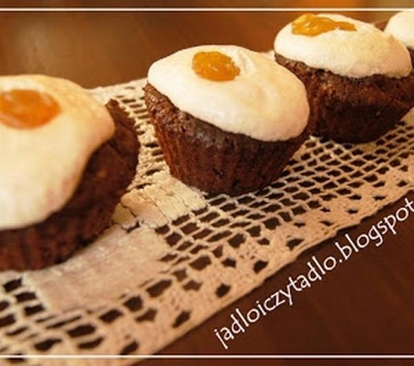 bezy i dokładnie ubić. Następnie szprycą wyciskać na wierzch mufinek.Ja do masy bezowej dodałam zbyt ciepłą masę marshmallow dlatego trochę mi się rozlała.