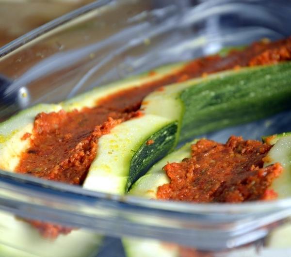 Cukinie dzielimy na ok. 20 cm części, które kroimy wzdłuż a następnie usuwamy część z pestkami.W wydrążonym miejscu umieszczamy pastę i tak nafaszerowane warzywo układamy w naczyniu (wcześniej wysmarowanym delikatnie