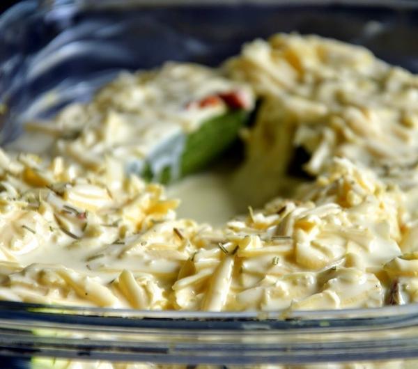 żółty ser. Wszystko znowu mieszamy, przyprawiamy