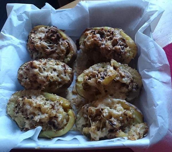 ziemniaki przekrawamy na pół i wydrążamy środek pozostawiając ok 0.5 cm krawędzi.Przygotowanie farszu: