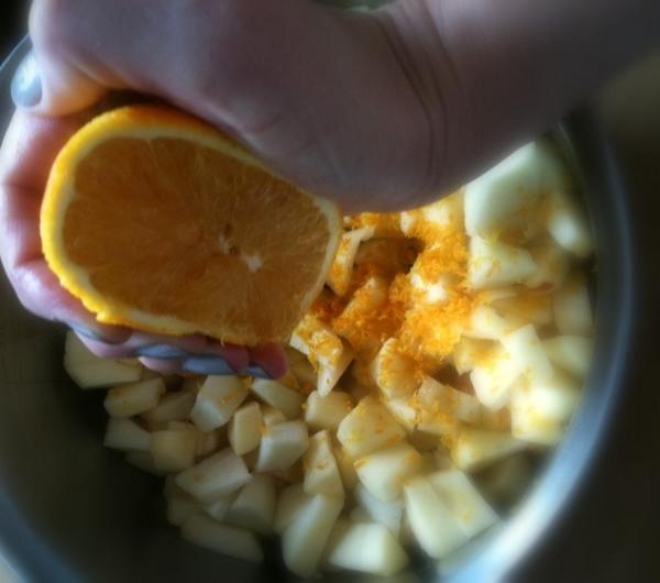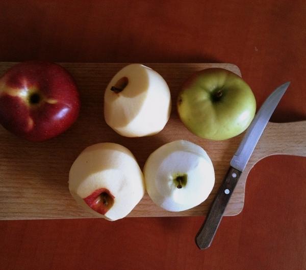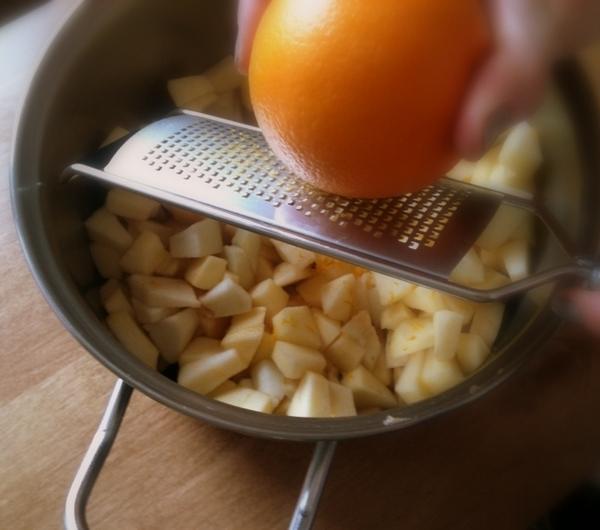 Jabłka obieramy, kroimy w kostkę (jak na szarlotkę). Wkładamy do rondla, dodajemy skórkę otartą z 1/2