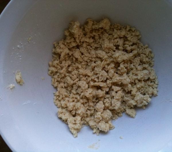 masło ugniatając caly czas w palcach, aż do uzyskania konsystencji wilgotnego piasku. Dodajemy
