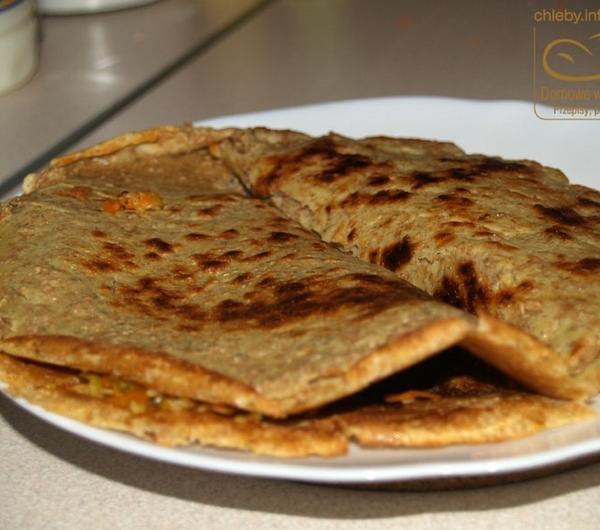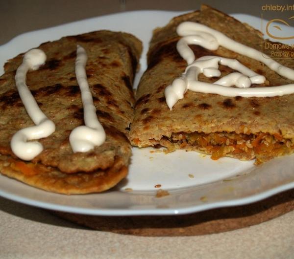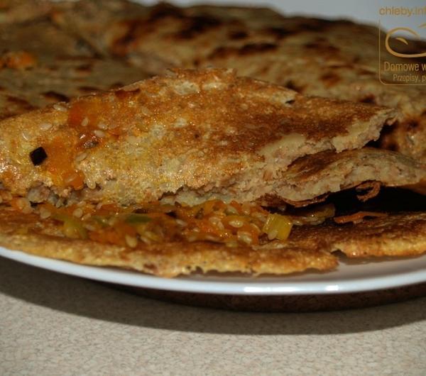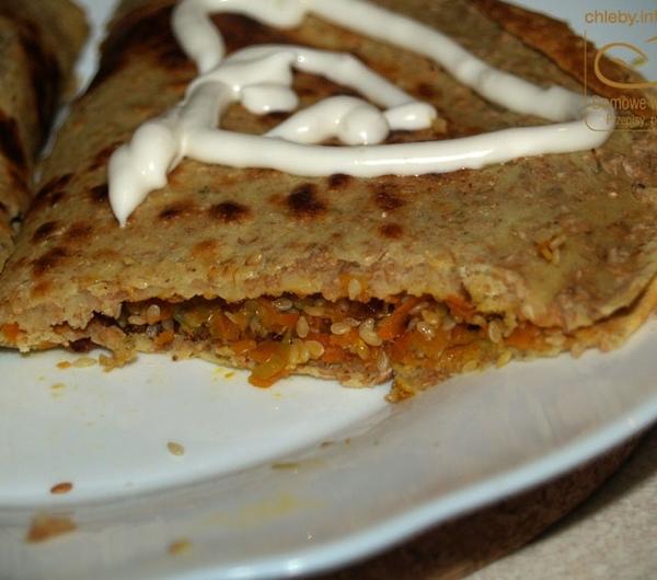 Na weekend wpadła do nas Justyna - przyjaciółka Madzi (coś czuję, że na dłużej zostanie testerką moich produktów, bo niestety Karolina - z przyczyn technicznych - chwilowo odstawiła się na boczny tor). I to dosłownie na weekend, bo jak przyjechała "tak na chwilę, tylko na wieczór" w sobotę, to wyjechała w poniedziałek :) No i jak popiliśmy nieco i jakieś tam inne rzeczy porobiliśmy to jeść się nam zachciało. A że człowiek już nieco zmęczony to i nic skomplikowanego robić się nie chce. Więc padł pomysł naleśników. Ale, że zawsze myślę o moim blogu (czyli o was :)) to nie mogły być to zwykłe naleśniki, bo to nuda przecież. Musiały zatem być jakieś inne. I oto one:Ciasto:2 szklanki mąki pszennej pełnoprzemiałowej grubomielonej1 szklanka mąki jaglanej800 ml mlekaszczypta gałki muszkatołowej1/3 łyżeczki pieprzu ziołowego1 łyżeczka majerankuszczypta kurkumy1/3 łyżeczka soli1 łyżeczka soku z cytryny1 łyżeczka olejuFarsz:1 duży por2 średnie marchewki70 g sezamu2 duże ząbki czosnku (jak ktoś lubi to można więcej)sólMieszamy w misce obie mąki, gałkę, pieprz, majeranek, kurkumę i sól. Dodajemy mleko i sok z cytryny, miksujemy porządnie i odstawiamy na 30 minut.Potem dodajemy łyżeczkę oleju, mieszamy i smażymy naleśniki. Będą dość grube z racji tej naprawdę grubomielonej pszennej mąki.Teraz farsz:Rozgrzewamy na patelni (albo najlepiej na woku, bo wygodniej) nieco oleju i wrzucamy pokrojonego pora i startą na grubych oczkach marchew. Mieszamy i podsmażamy ze 3 minuty. Dodajemy wyciśnięty czosnek i smażymy jeszcze minutę, czy dwie ciągle mieszając. Następnie dolewamy trochę wrzątku (tak z umiarem, nie za dużo, tak żeby na dnie trochę było) i dusimy warzywa do miękkości. Potem dosypujemy sezam, mieszamy i smażymy jeszcze przez chwilę, doprawiamy solą i gotowe.Nakładamy na połowę naleśnika, drugą połową przykrywamy i gotowe :) Inaczej raczej się nie da zawinąć, bo tak jak pisałem naleśniki są dość grube.Podawać z ulubionymi sosami.Jedzonko naprawdę pyszne, Madzia z Justyną potwierdzają :)A w kolejnym poście (wkrótce) rosyjskie bliny, które też serwowałem w ten pamiętny i uroczy weekend z Justyną :)Dodam jeszcze tylko, że bliny Justynie smakowały, mi też, Madzi nie za bardzo. Czyli wygrywamy 2:1.Zresztą dojadam je teraz pisząc ten przepis :)---------------------------------------------------------------------Chcesz dostawać moje przepisy prosto na e-mail? Wpisz swój adres z prawej strony w okienko "Przepisy prosto na twój e-mail!". Od tej pory żaden przepis Ci nie umknie :)