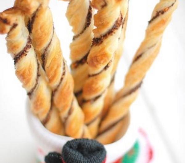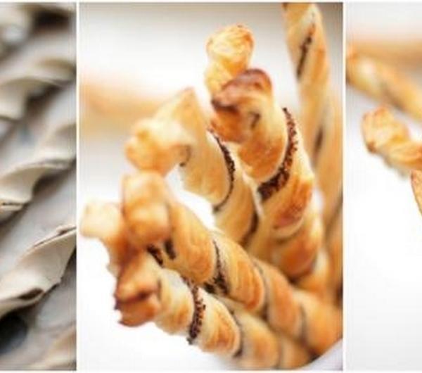 bakalie. Przykryć drugim arkuszem, dobrze docisnąć i pokroić, wzdłuż krótszej krawędzi na paski centymetrowej szerokości. Każdy pasek chwycić po dwóch końcach i obkręcać w przeciwne strony, aż powstanie świderek.Układać na blaszce, wyłożonej papierem do pieczenia, w kilkucentymetrowych odstępach.Piec do zarumienienia, około 10 minut w temperaturze 200 stopni.Smacznego!