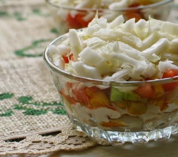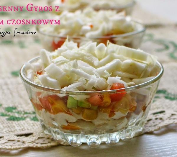 Składniki na dwa spore półmiski (na zdjęciach jest tylko propozycja podania, w rzeczywistości sałatki wyjdzie sporo):pęczek świeżego szczypiorkupuszka kukurydzy konserwowej3 świeże pomidoryzielony ogórek szklarniowy - dorodna sztuka, duża (lub dwa mniejsze)80 dag filetów z piersi kurczakaprzyprawa gyrosłyżka oleju do podsmażenia mięsaśredniej wielkości kapusta pekińskaszklanka gęstego jogurtu naturalnego2 płaskie łyżeczki czosnku granulowanego do sosu - lub więcej wg. gustusól i pieprz, oraz szczypta pieprzu cayenne (po szczypcie)Wykonanie:Kapustę poszatkować dość drobno, na kawałki o długości 2-3 cm. Posolić delikatnie. Ogórki obrać ze skóry, pokroić w drobną kostkę. Pomidory umyć, usunąć resztki gałązek, pokroić w kostkę, odcisnąć z nadmiaru soku. Kukurydzę odsączyć z zalewy. Szczypiorek umyć, posiekać.Mięso pokroić na nieduże kawałki. Na patelni rozgrzać tłuszcz, włożyć mięso, dodać przyprawy, łyżkę lub dwie. Próbować, regulować smak ( w zależności od firmy przyprawy są ostrzejsze lub łagodniejsze). Smażyć około 5-10 minut, tak by mięso nie było surowe w środku. Ostawić do przestygnięcia.Do jogurtu dodać czosnek granulowany (pamiętajcie że sos z czasem nabiera wyrazistości, przegryzą się), sól, pieprz i cayenne. Dokładnie połączyć.W półmiskach układać kolejno (dzielić składniki na pół jeżeli chcecie zrobić dwie porcje) :- pierwsza warstwa kapusty pekińskiej,- warstwa mięsa- sos czosnkowy- kukurydza- ogórki- szczypior- pomidor- druga warstwa kapusty pekińskiejSałatka najlepsza jest, kiedy jest podana bezpośrednio po przygotowaniu, ze względu na kapustę pekińską, oraz świeże warzywa. Kapusta po posoleniu mięknie i jeżeli sałatka będzie długo stała może podejść sokami warzywnymi.Smacznego! :)