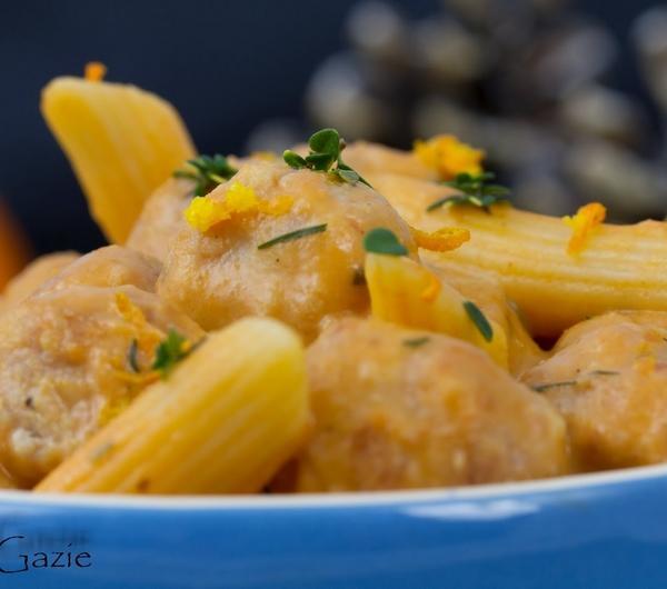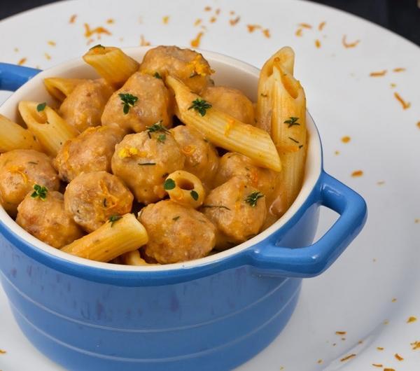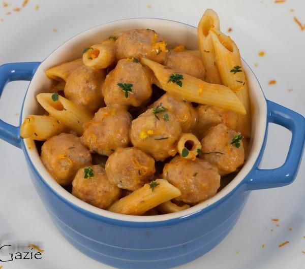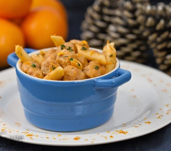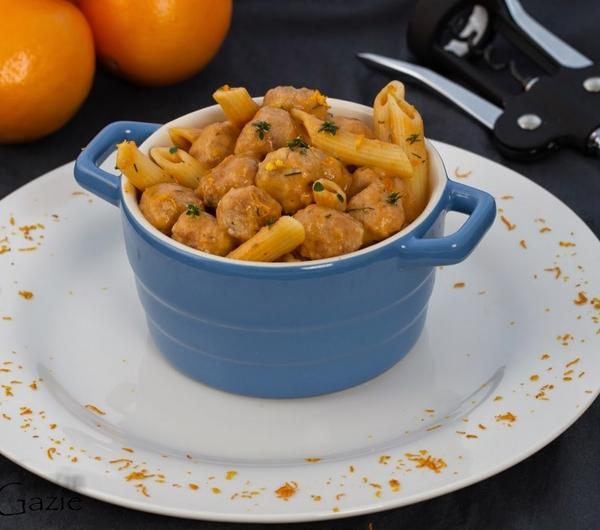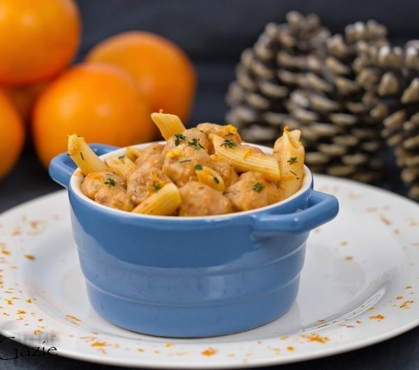 SOSDo usmażonych pulpecików dodajemy cebule pokrojoną w drobna kostkę , gdy się zrumieni na złoty kolor dodajemy pomidory i dusimy około 15-20 minut co jakiś czas mieszając . Na koniec dodajemy zioła , przyprawy , śmietanę oraz sok i startą skórkę z pomarańczy.Chwile dusimy i dodajemy ugotowany al dente makaron penne.