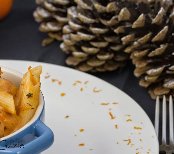 przepis na dwie-trzy porcje.250 gram makaronu pennepulpety1 puszka krojonych pomidorów2 łyżki tłustej śmietanysok z jednego pomarańczaskórka starta z jednego pomarańcza2 łyżeczki posiekanego kopru2 łyżeczki świeżego tymianku - ewentualnie suszonegocukier ,sól i pieprz do smaku
