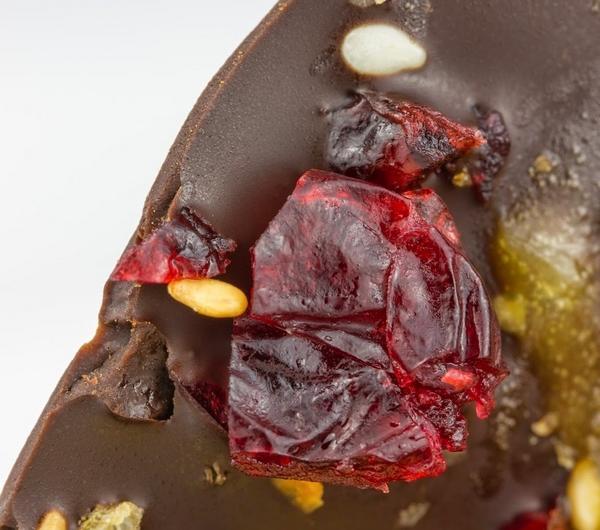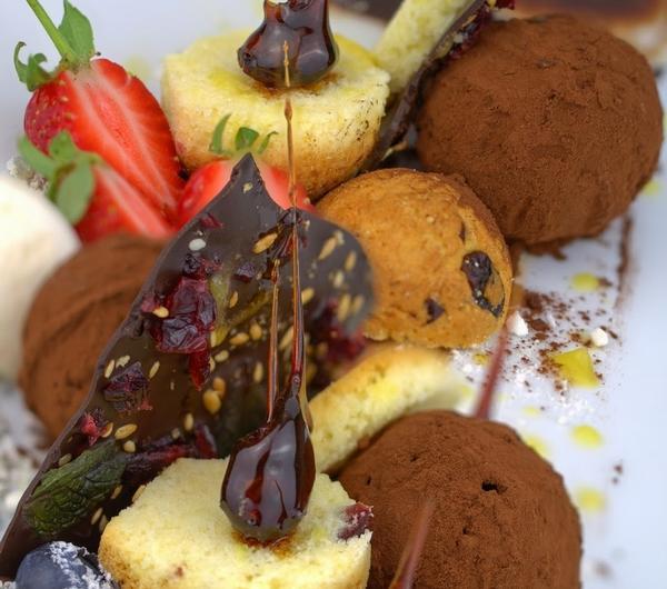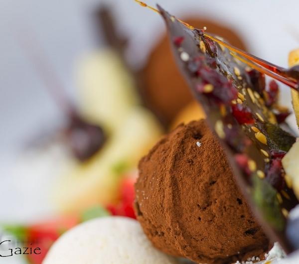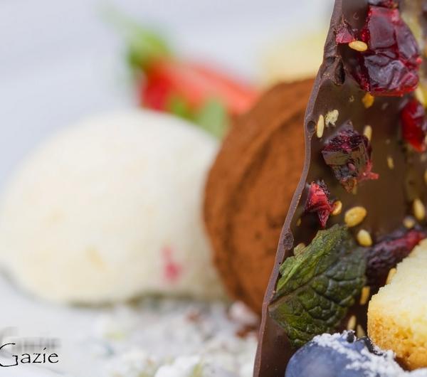 NA PŁATY CZEKOLADOWE10 gram gorzkiej czekolady o zawartości 70 % kakao1 łyżka sezamu1 łyżka drobno pokrojonej żurawinykilka listków miętyCzekoladę rozpuszczamy w kąpieli wodnej , wylewamy ją na papier do pieczenia w kształcie prostokąta posypujemy żurawiną , sezamem i kładziemy listki mięty - wkładamy do zamrażalnika na około 15 minut . Zastygniętą czekoladę łamiemy i dekorujemy deser.