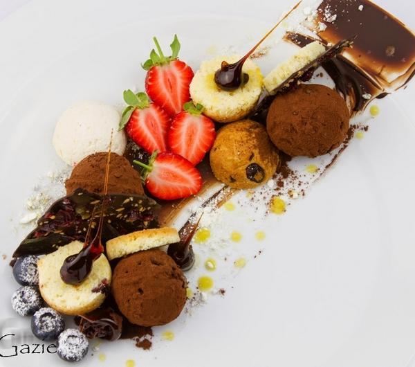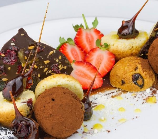 DODATKOWO1/2 sztuki mango zblendowanego - do zrobienia kropek50 gram rozpuszczonej gorzkiej czekolady - do posmarowania talerzapokruszone bezytruskawkiborówkicukier puder - do obsypania borówek