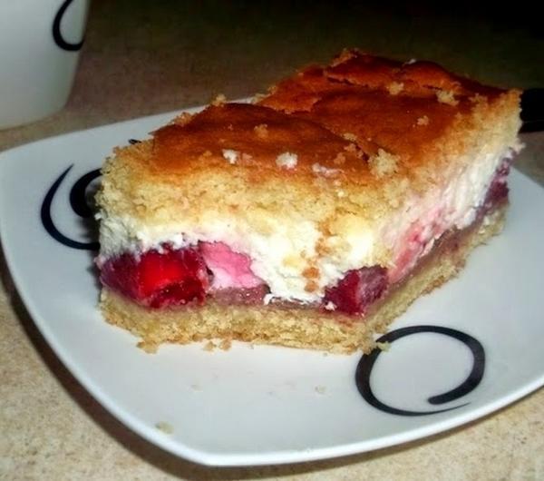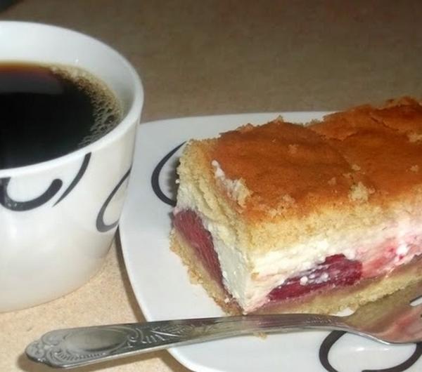Składniki:1 kostka masła8 łyżek cukru1 opakowanie cukru waniliowego4 jajka7 łyżek mąki5 łyżek mleka2 płaskie łyżeczki proszku do pieczeniaMasa:60 dag truskawek1 czekolada mleczna2 kostki twarogu6 łyżek cukru1 opakowanie galaretki cytrynowej lub brzoskwiniowej2 łyżki soku z cytryny45 dag śmietany 30%Wykonanie:Masło ucieram z cukrem i cukrem waniliowym na puszysty krem. Miksując wbijam po kolei 4 jajka, wsypuję 3 łyżki mąki i wlewam zimne mleko. Pozostałą mąkę mieszam z proszkiem do pieczenia, dodaję do masy i miksuję do połączenia się wszystkich składników. Blachę wykładam papierem do pieczenia, przekładam ciasto i wstawiam do piekarnika nagrzanego do temp.200'C na 20-25 min. Upieczone wyjmuję, studzę i kroję wzdłuż na 2 części. Czekoladę rozpuszczam w kąpieli wodnej i smaruję spód ciasta. Truskawki, myję, usuwam szypułki, kroję na połowy i układam na posmarowanym czekoladą spodzie ciasta wypukłą stroną do góry. Twaróg miksuję z cukrem. Galaretkę rozpuszczam z szklance wrzątku, studzę i cienkim strumieniem dolewam do masy twarogowej. Kremówkę ubijam na sztywno i mieszam z serem za pomocą drewnianej łyżki, by masa pozostałą delikatna i puszysta. Masę przelewam na spód z truskawkami ( masa jest płynna) i wstawiam do lodówki na godzinę. Po godzinie przykrywam drugim kawałkiem ciasta i schładzam jeszcze 5-6 godzin.