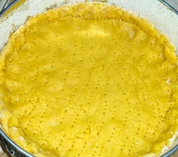 Średniej wielkości tortownicę wykładam papierem do pieczenia, boki smaruję masłem i posypuję bułka tartą. Do tak przygotowanej tortownicy wkładam ciasto, nakłuwam widelcem i wstawiam do piekarnika nagrzanego do 180'C na 10 min.