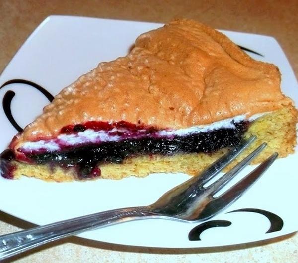 Kruche ciasto:30 dag mąki pszennej15 dag masła2-3 łyżki cukru pudru1/2 łyżeczki proszku do pieczenia4 żółtkaMus jagodowy:1 szklanka jagód2 łyżki cukru1 opakowanie galaretki o smaku owoców leśnychBeza:4 białka1-2 łyżki cukruWykonanie:Żółtka ucieram z cukrem, dodaję porcjami przesianą mąkę z proszkiem do pieczenia, wiórki masła i wszystko razem zagniatam.Gotowe rozwałkowuję na placek.