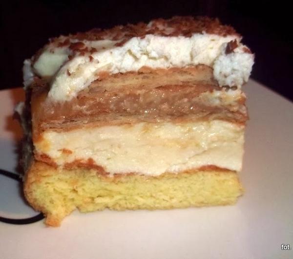 Składniki:1 kostka masła0,5 litra mleka2 budynie waniliowe1,5 kostki margaryny1 szklanka cukru2 paczki herbatników1 puszka mleka skondensowanegoMasa śmietankowa:2 śmietany kremówki2 zagęstniki typu śmietan-fixBiszkopt:4 jajka3 łyżki mąki8 łyżek cukru1 łyżeczka proszku do pieczenia1 łyżka octuWykonanie:Upiec biszkopt. Z mleka odlać pół szklanki, rozrobić w tym budynie, resztę mleka zagotować i ugotować budyń i wystudzić. Masło utrzeć z cukrem, dodając porcjami zimny budyń. Gotową masę wyłożyć na biszkopt, ma masę ułożyć paczkę herbatników. Mleko w puszce wrzucić do wody i gotować ok 2-3 godz. Ciepłą masę karmelową wyłożyć na herbatniki, przykryć drugą paczką herbatników.Śmietanę kremówkę ubić razem z zagęstnikiem. Jeżeli jest zbyt płynna można dodać rozpuszczoną w niewielkiej ilości wody, żelatynę. Gotową masę śmietankową wyłożyć na herbatniki i wstawić do lodówki, najlepiej na całą noc.