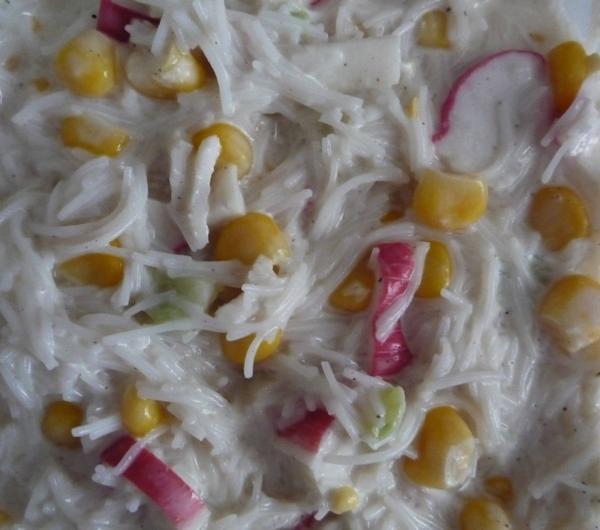 Makaron przygotowujemy wg. przepisu na opakowaniu. Czyli zalewamy wrzątkiem i odstawiamy, pod przykryciem na kilka minut. Następnie odcedzamy, siekamy nożem na drobniejsze kawałki i odstawiamy do ostygnięcia. Paluszki surimi kroimy w plastry,