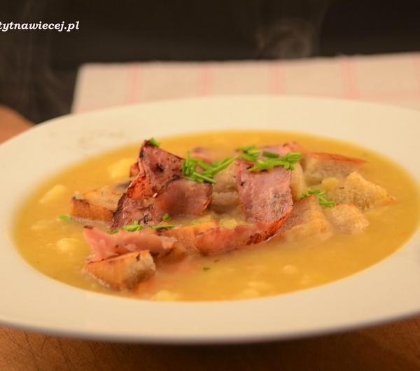 Składniki:2 litry wody1 szlankę grochu ( najlepiej łuskanego, w połówkach)4 - 5 średnie ziemniaki1 średnia marchewka1 mała pietruszka2 ząbki czosnku1/2 cebuli1 listek laurowy,3 ziela angielskie1 łyżki posiekanego szczypiorkusól, pieprz, curry4 kromki chleba1 łyżka masła20 dag wędzonego boczku w plastrachDo garnka z zimną wodą włóż cebulę, listek laurowy, ziele angielskie, wypłukany na sicie oraz odsączony groch i gotuj pod przykryciem około 45 - 50 minut. Po tym czasie dodaj obrane i pokrojone w kostkę ziemniaki, obrane i starte na tarce o dużych oczkach marchewkę i pietruszkę oraz posiekany ząbek czosnku. Dodaj sól i curry (ilosc według Twojego uznania). Gotuj przez około 20 - 25 minut w tym czasie przygotowując chipsy z plastrów boczku (boczek pokrój w długie paski, wysmaż na rozgrzanej patelni na chrupiąco) oraz grzanki( na rozgrzanej patelni zrumień chleb posmarowany masłem i pokrojony w kostkę),Gotową, gorącą zupę dopraw pieprzem i wykładaj na talerze, dodając grzanki i boczkowe chipsy.