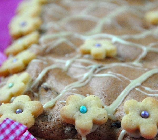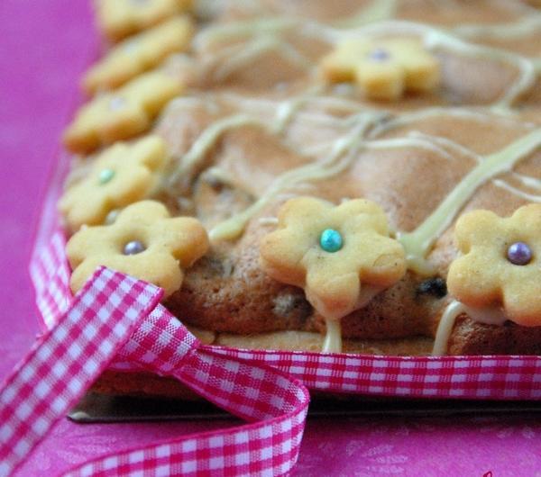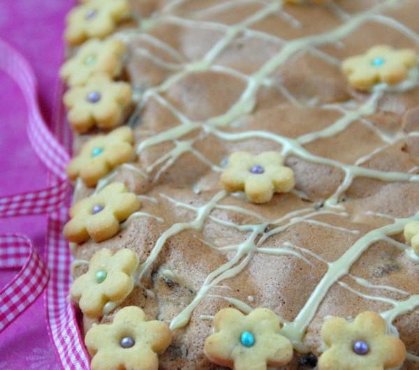 mące, jeszcze raz wymieszać i wyłożyć masę na podpieczony spód.Nastawić piekarnik na 160°C i piec w nim mazurek 35-40 minut. Wystudzić.Polać ciasto lukrem i używając jego reszty jako "kleju" przykleić upieczone wcześniej kwiatki na brzegach mazurka. W środku każdego kwiatuszka umieścić mały