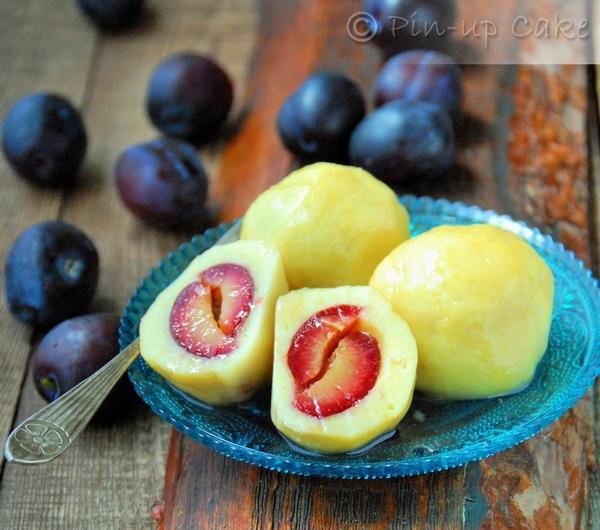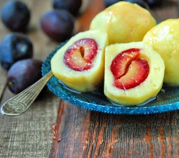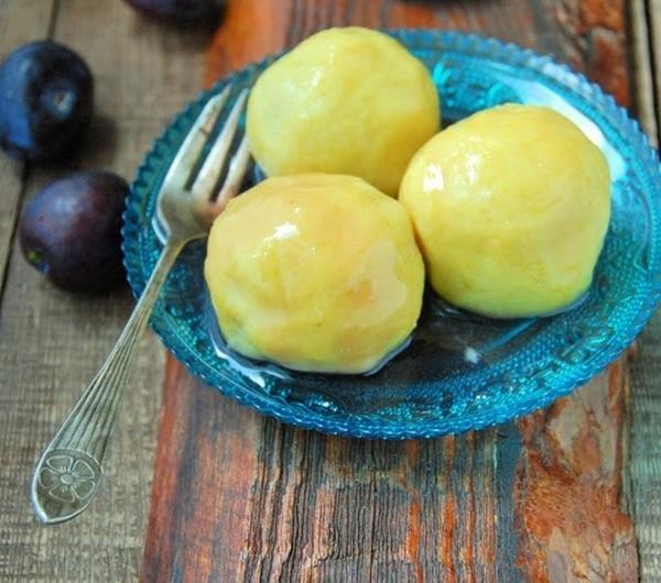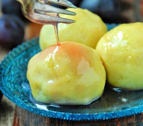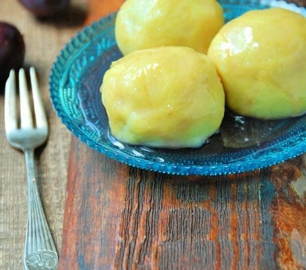 Mam dużo śliwek. Jakaś wczesna odmiana obrodziła w sadzie Rodziców. Jak śliwki, to oczywiście knedle. Tradycyjne z gotowanych ziemniaków z dodatkiem mąki. Ale nie byłabym sobą, gdybym je tradycyjnie podała. Oczywiście kwestia wyboru. Można je polać roztopionym masłem, posypać cukrem oraz cynamonem, zaserwować ze śmietaną, a ja polałam je syropem rabarbarowym.Knedle najlepiej jeść od razu, bo gdy poleżą zbyt długo robią się gumowate i twarde. Grubość ciasta to też kwestia indywidualna. Ja lubię takie troszkę grubsze.Składniki na ok. 12-14 sztuk:450 g ziemniaków, zważonych po obraniu125 g mąki pszennej25 g mąki ziemniaczanej1/4 łyżeczki soli1 jajko12-14 śliwek, umytych i wysuszonych2 łyżki cukru, do posypania śliwek (u mnie ciemny trzcinowy Muscovado)szczypta cynamonu, opcjonalnieZiemniaki ugotować w osolonej wodzie. Przecisnąć przez praskę i odłożyć do wystygnięcia.Ze śliwek wydobyć pestki nacinając je do połowy. Posypać równomiernie cukrem oraz cynamonem. Odstawić na bok.W dużym garnku zagotować wodę z solą.Ziemniaki zagnieść z oba rodzajami maki, solą oraz jajkiem. Oderwać kawałek ciasta, spłaszczyć w dłoni kształtując placuszek, w środek położyć zamkniętą śliwką i zlepić ciasto wokół niej. Uformować kulę. W razie potrzeby oprószyć dłonie mąką. Odłożyć na stolnicę, przykryć ściereczką i ulepić kolejne knedle.Knedle wrzucać na wrzątek i gotować przez ok. 3-4 minuty od wypłynięcia (w zależności od grubości ciasta). Podawać od razu z ulubionymi dodatkami.Syrop rabarbarowy:50 g cukru50 ml wodysok z połowy cytryny40 g oczyszczonego rabarbaru (części czerwone), pokrojonego na drobno (można również użyć borówek, jagód, malin, porzeczek, a także śliwek - owoców, które dadzą kolor)W małym garnku wymieszać cukier, wodę, sok z cytryny i podgrzewać na małym ogniu, aż cukier się rozpuści. Następnie dodać kawałki rabarbaru (lub innych owoców) i podgrzewać dalej, aż rabarbar się rozpadnie, a sok zamieni w syrop (ok. 4-5 minut). Odcedzić na drobnym sitku, zachowując płyn.Po schowaniu do lodówki zgęstnieje jeszcze bardziej.Można go przechowywać w lodówce do dwóch tygodni w zamkniętym słoiczku. Używać do słodzenia, do deserów, a dodając do niego cukier puder uzyskamy naturalnie barwiony lukier do drożdżówek.Życzę smacznego!