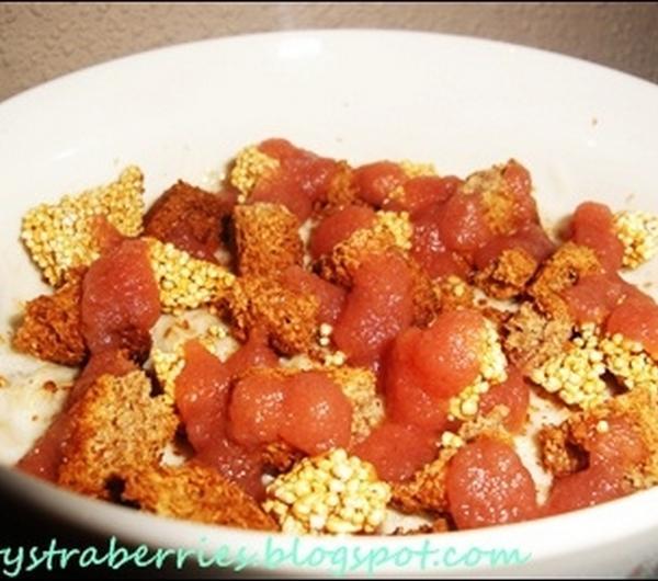 potem doszło jabłuszko ;)porridge with milk , chopped walnuts , otrębusek , nut cookie with amaranth and mousse with apples and strawberries ,