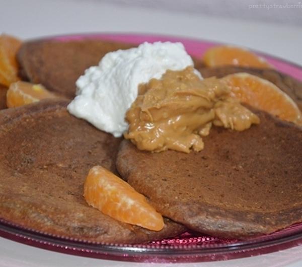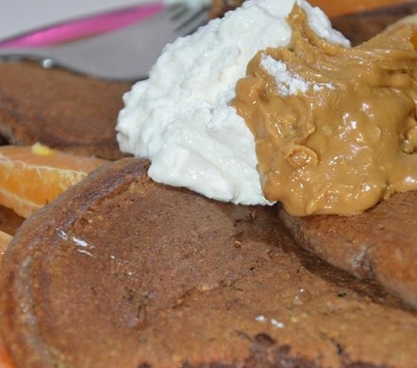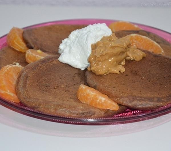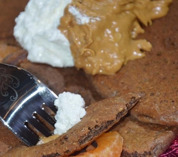 mandarynkąoat* cocoa pancakes with natural cream cheese, grani cottage cheese, peanut butter and mandarine*z