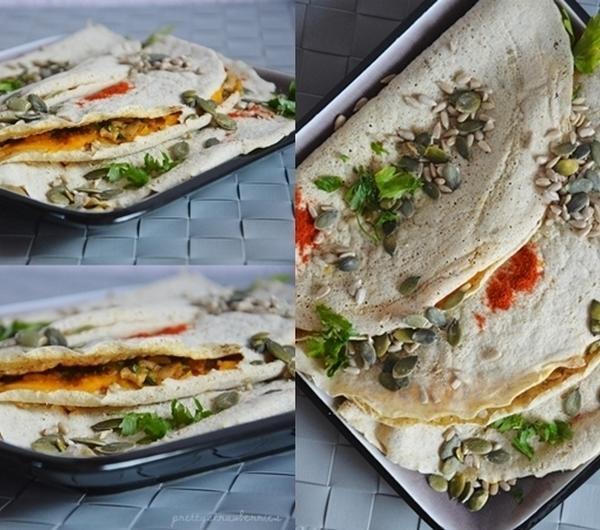 pestkami dynivegan spelt and oat crepes with pumpkin puree, fried onion, champignons and zucchini served with sunflower and pumpkin seedsnadzienie: puree z dyni Hokkaido,