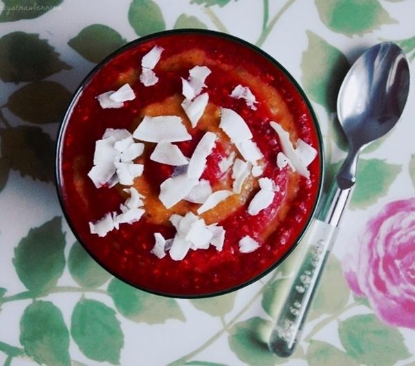 pudding with cashews and raspberries served with raspberry and peach mousse and coconut flakes