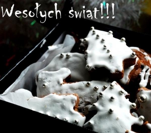 Jeśli przeżyjemy dzisiejszy dzień to będzie znaczyło, że o to czy tegoroczne święta odbędą się czy nie - możemy się nie martwić. Lepiąc pierniki w cieniu starodawnych przepowiedni pomyślcie, że może to już ostatni raz....No to powodzenia : )Przepis pochodzi od Julki, która tegoroczne święta spędza w Szkocji. Dlatego wysyłamy jej chociaż wirtualny zapach jej wypieków i życzymy wesołych!Recepturę bardzo nieznacznie zmieniłam.Przepis na lukier pochodzi z zabytkowej książki teściowej - i też teściowa jest za jego wykonanie odpowiedzialna. :) Wyszedł rewelacyjnie, ale jego wykonanie zajmuje sporo czasu.Czas wykonania 2 dni.Co potrzebujesz na ok. 165 pierników?Pierniki:1 kg pszennej mąki3/4 szkl. cukru200 ml płynnego miodu2 łyżeczki proszku do pieczenia4 łyżeczki amoniaku1,5 kostki masła5 jajek4 łyżki syropu karmelowego lub golden siroup lub karmelu z 0,5 szkl. cukru2 opakowania przyprawy do piernikówLukier:3 białka0,5 szkl wody300 g cukru1 łyżka octu 3%2 garnkiCo teraz?1. W misce łączymy mąkę, cukier, miód, proszek do pieczenia, amoniak, jajka, karmel, przyprawę do pierników i miękkie masło - w razie potrzeby można je rozpuścić - ja tak zrobiłam. Zagniatamy ciasto, do uzyskania gładkiej i zwartej konsystencji. Zawijamy w siatkę i wkładamy do lodówki na noc.2. Następnego dnia dzielimy ciasto na mniejsze części, stół posypujemy mąką, wyrabiamy ciasto po kawałku, rozwałkowujemy na grubość ok. 2 -3 mm. i wycinamy foremkami różne kształty. Pierniki wstawiamy kolejno do pieca nagrzanego do 180 C i pieczemy ok. 8-10 min. Aż wyrosną i lekko się zrumienią. Upieczenie tylu pierników zajęło mi 2,5 h.