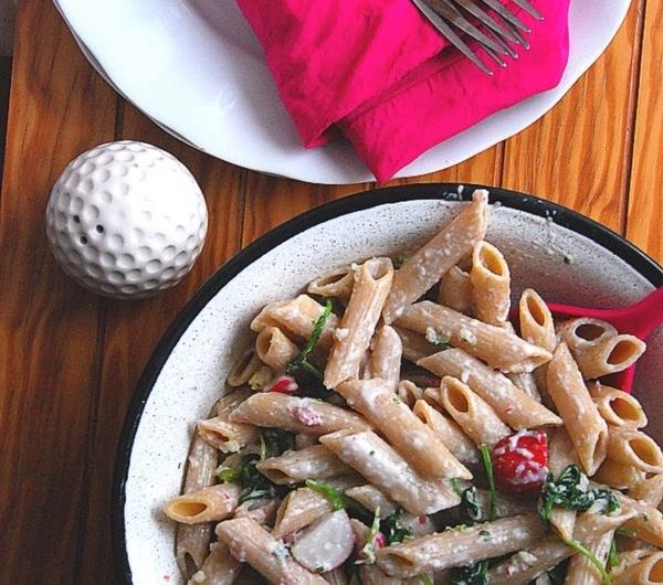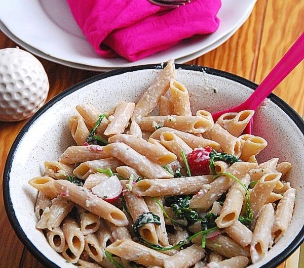 boczku :) Co by ci było lepiej na duszy :)English: Horseradish pesto penneWhat do you need for 2 servings ?any pasta - as much as you eat8 radishes + green leaves2 tablespoons Greek