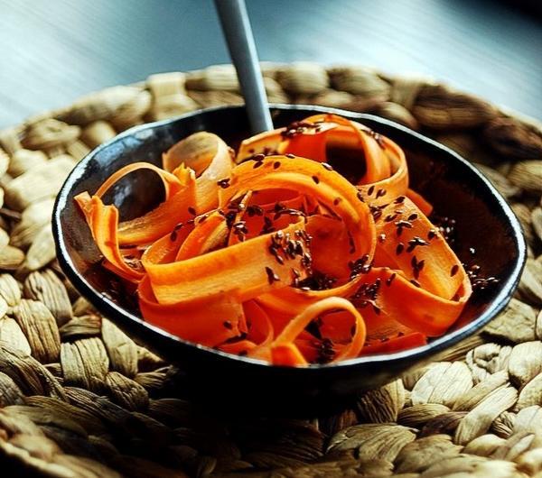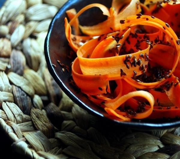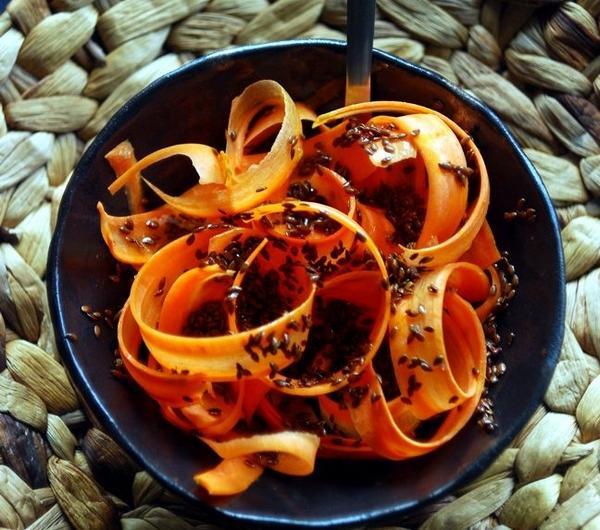 Carrot ribbons with roasted flaxseedpreparation time : 10 minutesWhat do you need ?1 large carrot,peeled and cut into thin strips preferably with a vegetable peeler1 teaspoon of flaxseeda few drops of good olive oilNow what?1. Roast the flax seeds on a dry frying pan. It is ready when it starts popping .2. Pour olive oil over carrot,sprinkle with roasted flaxseed and serve.