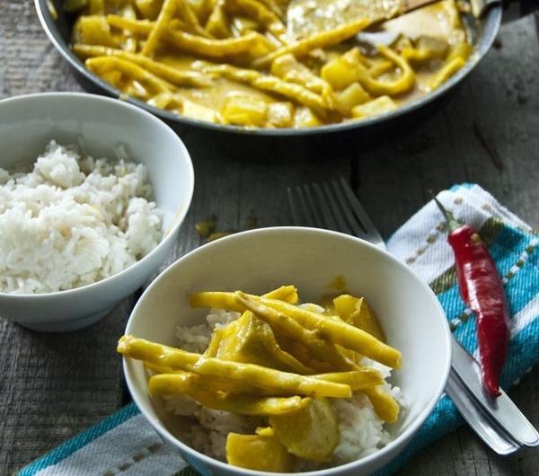 Kalarepę - jedno z niewielu warzyw wywodzących się z północnej Europy - znano już 500 lat temu. To niewiele w porównaniu do kapusty czy kalafiora, który gościł na stołach starożytnych Rzymian. Pierwsze opisy tego warzywa pochodzą z XVI wieku. Otrzymano je poprzez ewolucję grubej kapusty, charakteryzującej się soczystą łodygą. Korzeń kalarepy przypomina w smaku rzepę, choć wyczuwamy w niej o wiele subtelniejszą nutę. Warzywo jest bogate w witaminę C, błonnik i potas, który odgrywa ważną rolę w utrzymaniu prawidłowego ciśnienia krwi.Dziś mamy dla Was curry z delikatnej kalarepy, fasoli szparagowej i mleka kokosowego. Wszystko przesycone mieszanką indyjskich przypraw. Warto kupić gotową żółtą pastę curry. Jeżeli akurat nie macie jej pod ręką tu piszemy czym ją zastąpić.***Kohlrabi and string beans curryKohlrabi - one of the few vegetables coming from northern Europe - have been known for 500 years . It's not that much if we compare it to the cabbage or cauliflower,which hosted on the tables of the ancient Romans. The first descriptions of this vegetable come from the sixteenth century. They were obtained by evolution of thick cabbage, characterized by juicy stem . The root resembles the taste of turnip, although you can feel a lot more subtle note. The vegetable is rich in vitamin C, fiber and potassium,which plays an important role in maintaining normal blood pressure .Today we have for you a delicate curry with kohlrabi,string beans and coconut milk . All imbued with a mixture of Indian spices . It is worth to buy ready-made yellow curry paste . If you just do not have it on hand we're telling you here how to replace it.