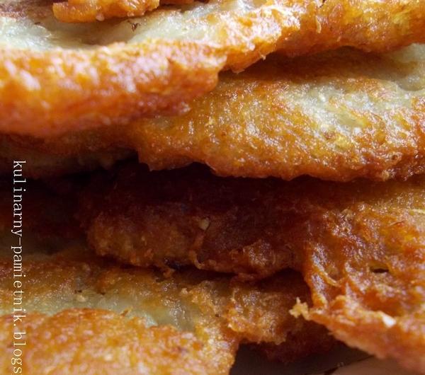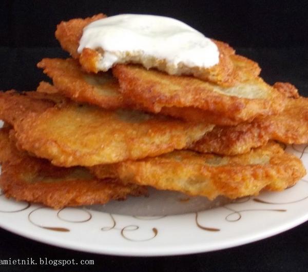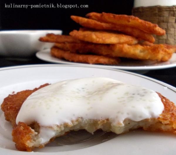 olej i po chwili wlewałam masę ziemniaczaną, formując cienkie placki.Smażyłam do zezłocenia, po czym przewracałam na drugą stronę.Usmażone placki osuszałam z nadmiaru tłuszczu na talerzu wyłożonym ręcznikami papierowymi.Podawałam gorące z