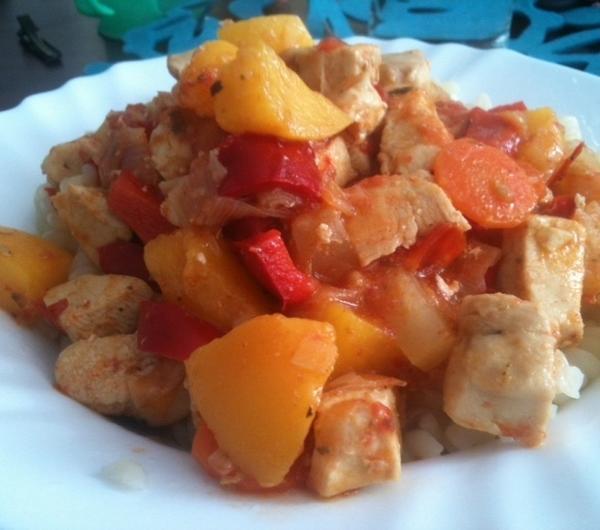brzoskwinię, gotujemy pod przykryciem przez 10 minut. Gotowe:) Ja podałam z kluskami ponieważ zabrakło