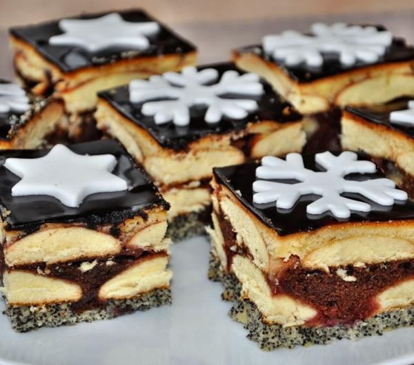 Składniki:2,5 szklanki mąki1,5 kostki margaryny8 jajek2 szklanki cukru pudru2 łyżeczki proszku do pieczenia2 łyżki kakaopół szklanki maku3 paczki okrągłych biszkoptówsłoik dżemu morelowego lub malinowegoekstrakt z waniliiPrzygotowanie:Oddzielić żółtka od białek. Margarynę utrzeć z cukrem pudrem, dodając pojedynczo żółtka. Dodać mąkę wymieszaną z proszkiem do pieczenia, ekstrakt z wanilii, na koniec połączyć z pianą ubitą z białek. Ciasto podzielić na 3 równe części. Do jednej dodać kakao, do drugiej przesiany suchy mak, do trzeciej mąkę (2 łyżki). Na blachę (23x39 cm) wysmarowaną tłuszczem wyłożyć ciasto makowe, potem biszkopty, na nie cienką warstwę dżemu. Następnie ciasto kakaowe, ponownie biszkopty i dżem. Na wierzchu wyłożyć ciasto jasne. Nagrzać piekarnik na 180°C i piec przez ok. 40 min (do zrumienienia). Upieczone ciasto polać polewą czekoladową. Polewę zrobiłam z tego przepisu, z tymże zamiast barwnika dodałam 3 łyżki kakao.Źródło: Najlepsze wypieki czytelników "Poradnika domowego"