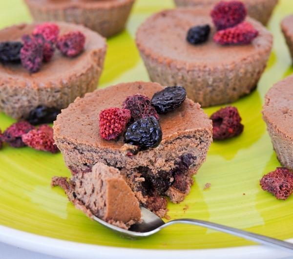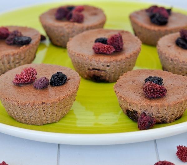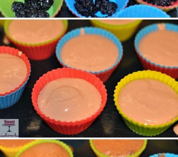 1. Piekarnik nagrzać do 135°C (termoobieg), lub 155°C (góra - dół).2. Na blasze od piekarnika ułożyć papilotki. Do każdej włożyć po garstce suszonych owoców.3. Miękkie masło utrzeć z cukrem i jajkami. Następnie (ciągle miksując) stopniowo dodawać twaróg, a na koniec kakao.4. Rozdzielić masę pomiędzy papilotki. Piec ok. 20-25 minut, aż ser się zetnie.5. Wystudzić i schłodzić w lodówce min. przez 4 godziny.