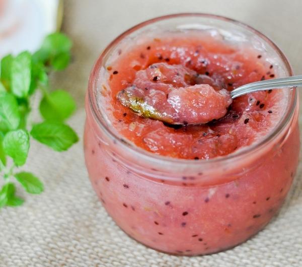 5. Dodać pozostałą ilość cukru i gotować do całkowitego rozpuszczenia.6. Następnie dodać sok z cytryny i dokładnie wymieszać. Jeśli dżem będzie za kwaśny - dodać więcej cukru.7. Na koniec dodać umyte listki mięty i wymieszać.8. Zebrać pianę (jeśli jest) i rozlać gorący dżem do słoików, wytrzeć ręcznikiem papierowym gwinty słoików, dobrze zakręcić i odstawić do góry dnem na ok. 10 min.Zaleca się pasteryzowanie dżemów przez ok. 20 min. (najwygodniej w ten sam sposób, co sterylizacja słoików - w piekarniku), jednak ja ten etap pomijam.