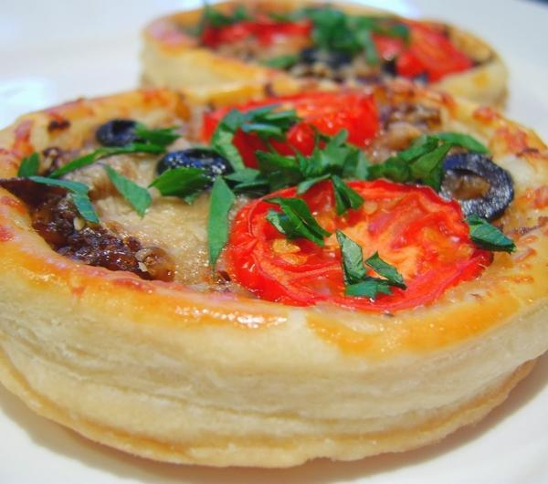 ciasta francuskiego nazywają się vol-au-vent, lecz wymagają one większej ilości ciasta, by utworzyć wyższe ścianki albo można kupić je gotowe w sklepach i zadbać jedynie o środek. Moja propozycja jest nieco inna, gdyż zapiekam ciasto razem z nadzieniem, które każdy może dobrać sobie sam. Jest to przekąska