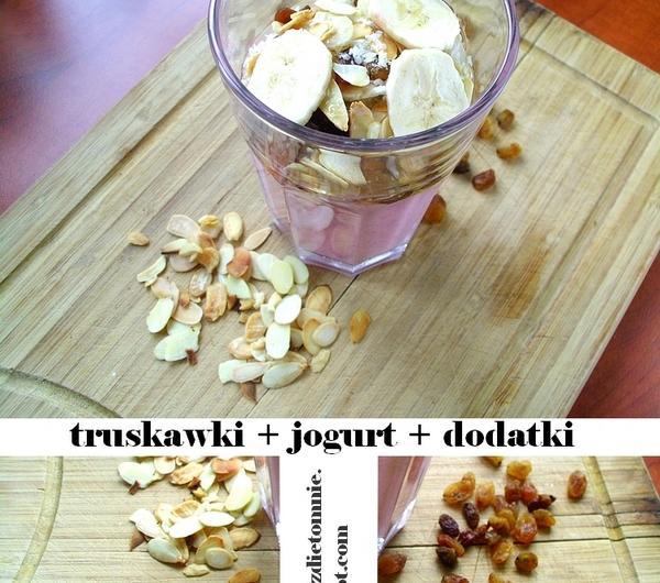 Migdały prażymy na suchej patelni. Truskawki (częściowo rozmrożone) blendujemy z jogurtem, wlewamy do wysokiej szklanki. Na wierzch układamy pokrojonego banana, posypujemy wiórkami, migdałami, rodzynkami. Polewamy syropem z agawy.