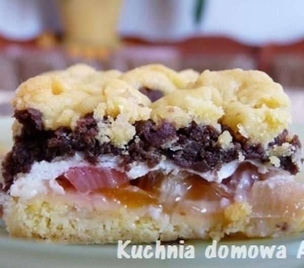 Składniki:Ciasto:0,5 kg mąki20 dag cukru pudru1 kostka margaryny1 łyżeczka proszku do pieczenia2 łyżki kakao1 opakowanie cukru waniliowego4 żółtkaRabarbarowe nadzienie:0,5 kg pokrojonego rabarbaru3 łyżki cukru2 łyżki mioduPiana:4 białkaodrobina soli3 łyżki cukruDodatkowo: 1 słoik dżemu brzoskwiniowego (w oryginale morelowego)Sposób przygotowania:1.Najpierw przygotowujemy rabarbarowe nadzienie: pokrojony rabarbar mieszamy z cukrem i miodem, odstawiamy na 2 godziny. Po tym czasie odsączamy rabarbar z nadmiaru soku.2. Z podanych składników zagniatamy ciasto (oprócz kakao) i dzielimy na 3 części. Do jednej dodajemy kakao i ponownie zagniatamy.3. Ubijamy pianę z podanych składników.4. Wykładamy jedną część ciasta na blaszkę, równomiernie rozkładamy najpierw dżem brzoskwiniowy (lub morelowy), a potem farsz rabarbarowy. Następnie wykładamy ubitą pianę z cukrem. Na pianę ścieramy najpierw ciasto kakaowe, a następnie jasne.5. Całość pieczemy w 180°C ok. 35-40 minut (do ładnego zrumienienia się wierzchu).SMACZNEGO :)Źródło: Moje ciacho