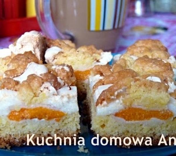 Składniki (u mnie blaszka 25 x 30 cm):2,5 szklanki mąkipół szklanki cukru1 kostka margaryny4 żółtka2 łyżeczki proszku do pieczeniaaromat waniliowy2 łyżki kwaśnej śmietanyPiana:4 białkapół szklanki cukru (w oryginale 1 szklanka)1 łyżka mąki ziemniaczanejOwoce:500 g wydrylowanych świeżych moreliSposób przygotowania:1. Z podanych składników zagnieść kruche ciasto. Podzielić na dwie części: 2/3 i 1/3. Obie zawinąć w woreczek foliowy, większą część włożyć do lodówki, a mniejszą do zamrażarki na 30 minut.2. Z cukru i białek ubić sztywną pianę, dodać mąkę ziemniaczaną i zmiksować na gładko.3. Blaszkę wyłożyć papierem do pieczenia, a następnie wyłożyć większe kruche ciasto. Na cieście rozłożyć morele, a na owoce ubitą pianę. Na pianę zetrzeć na tarce o dużych oczkach zamrożone ciasto.4. Całość piec przez 50-60 minut w 180 st. C (aż się ładnie zrumieni).Smacznego!!!