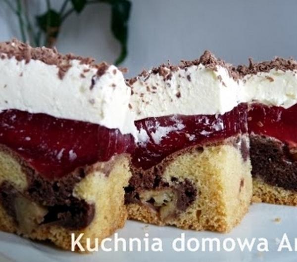 Składniki:Ciasto (blaszka 25x36 cm):2 szklanki mąki pszennej1 szklanka cukru2 łyżeczki proszku do pieczenia6 jajek1 kostka margaryny2 łyżki kakao2 łyżki mlekaaromat śmietankowy+ dowolne owoce (u mnie jabłka)Galaretka:2 galaretki wiśniowe750 ml wodyKrem:2 budynie śmietankowe750 ml mleka4 łyżki cukru1 kostka masła / margarynyWierzch:tarta czekolada lub polewa - wedle uznaniaSposób przygotowania:1. Robimy ciasto: margarynę ucieramy z cukrem na puch, dodajemy stopniowo po 1 żółtku, następnie dodajemy przesianą mąkę z proszkiem do pieczenia i aromat śmietankowy. Ubijamy pianę z białek i mieszamy z ciastem. Połowę ciasta wykładamy do blaszki. Do drugiej połowy dodajemy kakao i mleko, mieszamy i wykładamy na jasne ciasto. Na wierzch układamy pokrojone na cząstki owoce. Całość pieczemy w 180 st. C przez 40 minut (do suchego patyczka). Studzimy.2. Galaretkę rozpuszczamy w 750 ml wrzącej wody. Odstawiamy do lekkiego stężenia.3. Z 750ml mleka odlewamy 1 szklankę i mieszamy z budyniami. Pozostałe mleko zagotowujemy z cukrem, zalewamy mlekiem z budyniem i chwilkę gotujemy do zgęstnienia. Odstawiamy do wystudzenia. Masło w temperaturze pokojowej ucieramy, dodajemy po łyżce zimnego budyniu i miksujemy na małych obrotach.4. Na ciasto wylewamy tężącą galaretkę, wstawiamy do lodówki, aby mocno stężała. Na galaretkę wykładamy krem i wierzch posypujemy tartą czekoladą. Ciasto odstawiamy w chłodne miejsce.Smacznego!!!