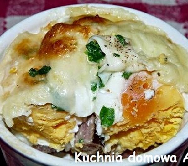 Składniki ( na 1 porcję):pokrojona w kostkę kiełbasa2 małe jajka (lub 1 duże)tarta mozzarellaszczypioreksól, pieprzSposób wykonania:1. Natłuszczone masłem lub olejem naczynie (kokilkę) napełniamy do połowy pokrojoną w kostkę kiełbasą. Następnie wbijamy jajka, delikatnie solimy i pieprzymy. Całość posypujemy szczypiorkiem i tartą mozarellą.2. Kokilki wkładamy do nagrzanego do 200 st. C piekarnika i zapiekamy. Czas zapiekania zależy od nas. Ponieważ mój mąż nie lubi jajek w wersji płynnej, więc zapiekałam je ok 20 minut. Można krócej, jeśli chcemy by jajko było na miękko.Smacznego!
