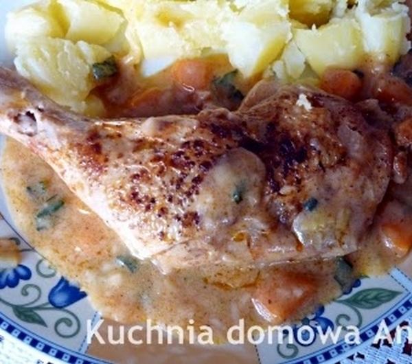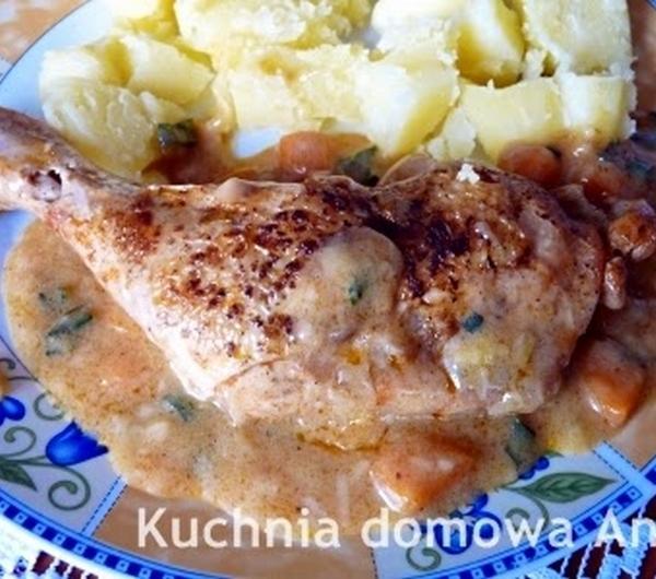 Składniki:4 nieduże udka2 marchewki1 porprzyprawa do kurczakawodamąkaśmietanaolejsól, pieprzziele angielskieliść laurowysiekana natka seleraSposób wykonania:1. Udka umyć, osuszyć, przyprawić przyprawą do kurczaka. Zrumienić mocno na oleju z obu stron. Zalać wodą, dodać liść laurowy i ziele angielskie, pokrojoną w kostkę marchewkę i posiekanego pora. Dusić do miękkości.2. W miseczce rozrobić śmietanę i mąkę (po 2 łyżki) i dodać trochę zimnej wody. Mięso wyjąć, wlać mieszankę z mąki, śmietany i wody, gotować do zagęszczenia sosu. Dodać siekaną natkę selera, doprawić solą i pieprzem do smaku, a na koniec z powrotem dodać mięso. Całość dusić jeszcze 1-2 minuty.Smacznego!!!