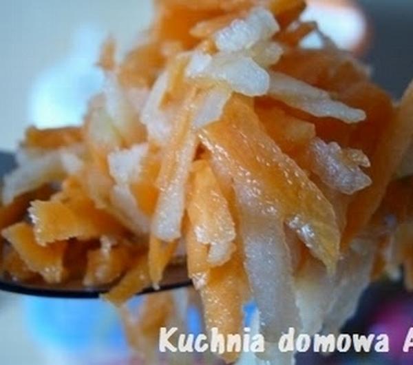 Składniki:4 marchewki2 winne jabłka1 łyżka soku z cytryny1 łyżeczka cukruSposób wykonania:1. Marchewkę i jabłka obieramy, ścieramy na tarce jarzynowej na dużych lub małych oczkach.2. Dodajemy sok z cytryny i cukier. Mieszamy. Przed podaniem odstawiamy na 1 godzinę, by surówka się przegryzła.Smacznego!!!P.S. Coś z domowego parapetu, w sam raz kiedy szaro buro za oknami :)